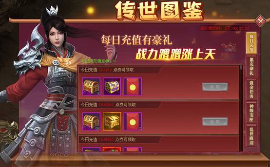 l 累计充值100元可领取:一段秘籍自选包*1、战神令*1、100精力瓶*2