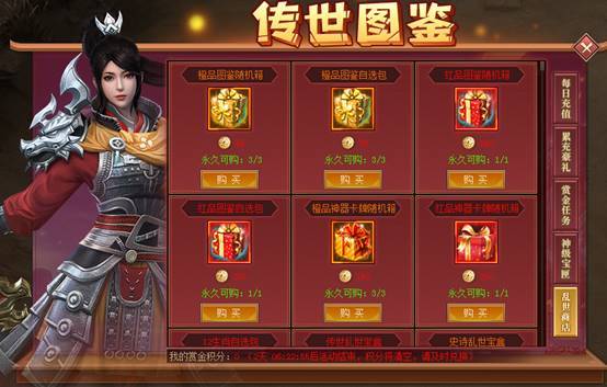 n 完成30次:史诗乱世宝匣*3、赏金积分*30、图谱之钥*100、金砖*30(可消耗3000元宝再领一次)