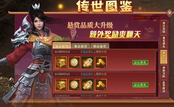 n 完成20次:传世乱世宝匣*2、赏金积分*60、图谱之钥*200、元宝卡*6000(可消耗600点券再领一次)