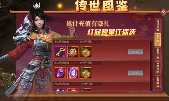 l 累计充值300元可领取:二段秘籍自选包*1、传世乱世宝盒*1、100精力瓶*2
