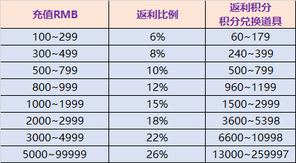 7、充值返利积分方案与活动一、二的礼包方案互斥、不可重复兑换;(例:当日充值100元,选择兑换60返利积分则不能再兑换100元档礼包,反之同理)