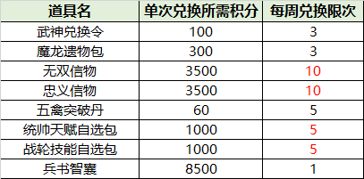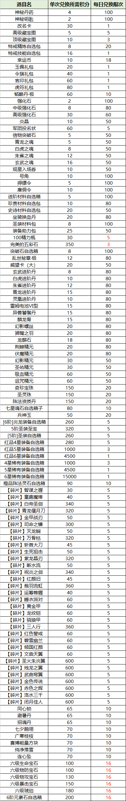 二、返利积分可兑换内容(表中所列道具单次兑换数量单位均为1)